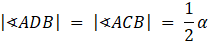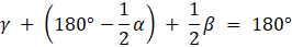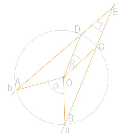 Dane są miary kątów α i β. Proste a i b przecinają się, wycinając a okręgu łuki. Podaj miarę kąta g gdy proste przecinają się poza okręgiem.