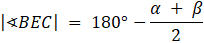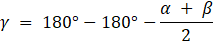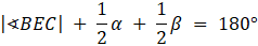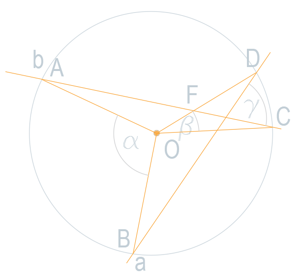 Dane są miary kątów α i β. Proste a i b przecinają się, wycinając a okręgu łuki. Podaj miarę kąta g gdy proste przecinają się wewnątrz okręgu.