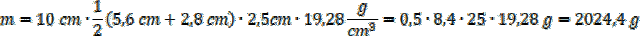 Przekrój poprzeczny sztabki jest trapezem równoramiennym o podstawach 5,6 cm i 2,8 cm oraz wysokości 2,5 cm. Sztabka ma 10 cm długości. Oblicz objętość, a następnie pomnóż ją przez gęstość złota, abyobliczyć masę sztabki.