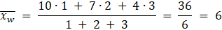 W konkursie łuczniczym strzelano z trzech odległości, punkty za pierwszą odległość miały wagę 1, z drugiej 2 a z trzeciej 3. Jaki wynik otrzyma łucznik, który za pierwsze strzelanie otrzymał 10 punktów, za drugie 7 a za trzecie 4?