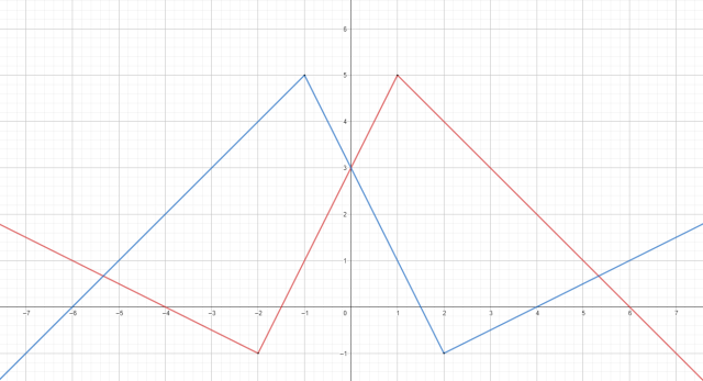 Należy przekształcić punkty wykresu funkcji f względem osi y. Kolorem czerwonym narysowany jest wykres funkcji f(x), a kolorem niebieskim funkcji g(x)=f(-x).