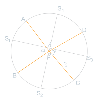Dany jest okrąg podzielony na cztery łuki przez punkty A, B, C, D. Udowodnij że prosta poprowadzona z środka łuku AB do środka łuku CD jest prostopadła z prostą przechodzącą przez środki pozostałych łuków.