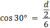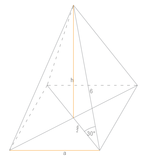 Dany jest ostrosłup prawidłowy czworokątny o krawędzi bocznej równej 6. Krawędź boczna z przekątną podstawy tworzą kąt o mierze 30°. Wyznacz wysokość ostrosłupa i długość jego krawędzi podstawy.