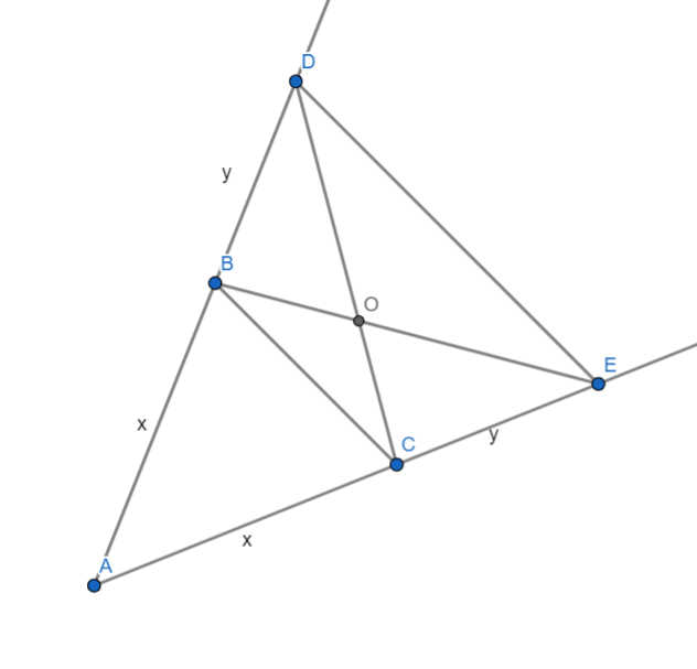 Na ramionach kąta o wierzchołku A odkładamy dwa odcinki AB i AC, gdzie długość odcinka AB jest równa długości odcinka AC. Następnie odkładamy kolejne dwa odcinki BD i CE, gdzie długość odcinka BD jest równa długości odcinka CE. Odcinki BE i DC przecinają się w punkcie O. Udowodnij, że prosta AO zawiera dwusieczną kąta BAC.