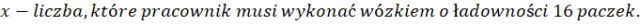 W tym zadaniu musisz określić, ile kursów wózkiem, na który można załadować 16 paczek, musiałby wykonać pracownik, jeżeli aby przewieźć cały ładunek wózkiem, na który można załadować 12 paczek potrzeba 15 kursów.