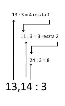 Powyższy przykład obrazuje jak wykonać dzielenie w pamięci. Po podzieleniu danej liczby przez 5, kolejne cyfry wyniku zostały zapisane. Wykonaj poniższe obliczenia w podobny sposób.