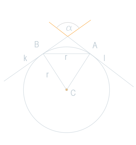 Podaj miarę α, jeśli proste k i l , są styczne do okręgu.