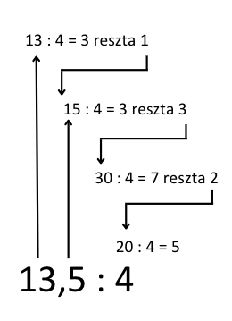 Powyższy przykład obrazuje jak wykonać dzielenie w pamięci. Po podzieleniu danej liczby przez 5, kolejne cyfry wyniku zostały zapisane. Wykonaj poniższe obliczenia w podobny sposób.