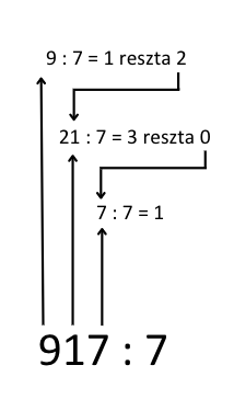 Powyższy przykład obrazuje jak wykonać dzielenie w pamięci. Po podzieleniu danej liczby przez 5, kolejne cyfry wyniku zostały zapisane. Wykonaj poniższe obliczenia w podobny sposób.