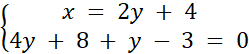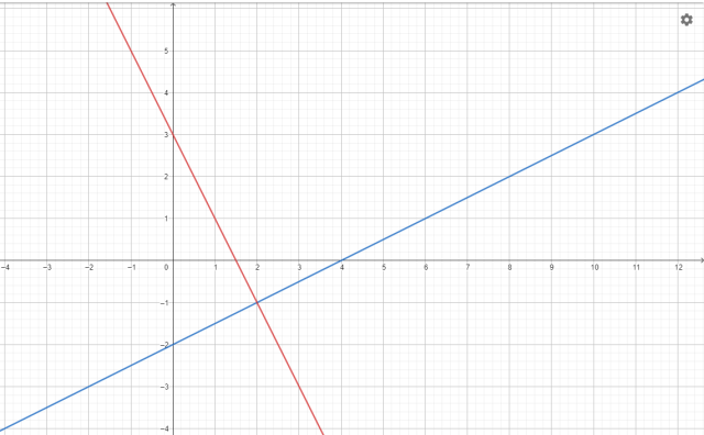 Znaleziono rozwiązanie podanego układu równań. Metoda przeciwnych współczynników polega odpowiednim przemnożeniu obu stron danego równania tak, aby po zsumowaniu obydwu równań, wyrażenia podobne się uprościły. Metoda podstawienia polega na zapisaniu jednej zmiennej w postaci wyrażenia zawierającego drugą zmienną (np. y = 2x – 2), a następnie wstawieniu tego wyrażenia do drugiego równania, w miejsce zmiennej. Aby sprawdzić poprawność obliczeń narysowano w układzie współrzędnych obu prostych i wyznaczano punkt ich przecięcia. Współrzędne punkty przecięcia osi odpowiadają wynikowi układu równań.