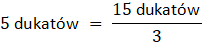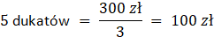 Wiedząc, że 15 dukatów to 300 zł, podziel przez 3 aby otrzymać ile to 5 dukatów.