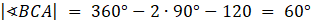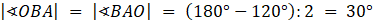 Trójkąt BOA jest oparty na promieniach okręgu, więc jest równoramienny, z sumy miar kątów w trójkącie: