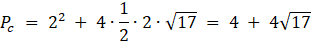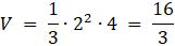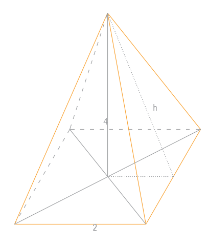 Dany jest ostrosłup prawidłowy czworokątny o krawędzi podstawy równej 2 i wysokości równej 4. Znajdź jego pole i objętość.