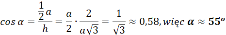 Oblicz długość wysokości, a następnie skorzystaj z funkcji trygonometrycznych, żeby wyznaczyć miarę kąta.