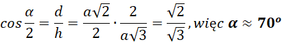 Oblicz długość przekątnej i wysokości, a następnie skorzystaj z funkcji trygonometrycznych, żeby wyznaczyć miarę kąta.