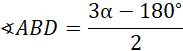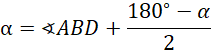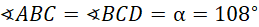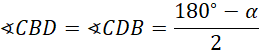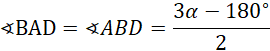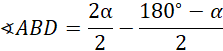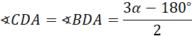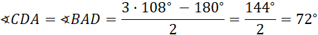 Wykorzystujemy relacje między kątami wewnętrznymi trójkątów równoramiennych, przystawanie figur oraz sumę kątów wewnętrznych czworokąta wypukłego.