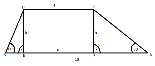 W tym zadaniu podaj, ile wynoszą pole i obwód trapezu o podstawach równych 4 cm i 18 cm, którego ramiona i dłuższa podstawa tworzą kąty 60° i 30°.