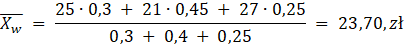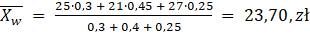 Kilogram cukierków kosztuje 25 zł, truskawkowych 21 zł, a cukierków z likierem 27 zł. Znajdź cenę 1 kg mieszanki składającej się z 30% cukierków orzechowych, 45% truskawkowych i 25% cukierków z likierem.