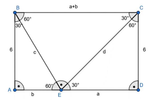 Oblicz skale podobieństwa do , do , do i oblicz pole trójkąta BEC, jeśli wiadomo, że i |DC|=6, jeśli na boku AD prostokąta ABCD obrano taki punkt E, że trójkąty ABE, DEC i EBC są podobne.