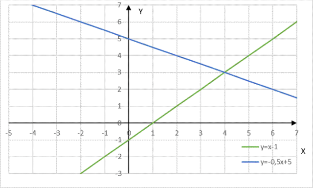 Aby wyznaczyć punkt przecięcia prostych, należy oba równania przyrównać do siebie. Następnie wyznaczamy pozostałe wierzchołki, które są punktami przecięcia prostych z osią OY, zatem wiemy, że argument dla takiego punktu jest równy zeru. Mając wyznaczone wierzchołki, skorzystaj ze wzoru na odległość między punktami A(xa, ya) i B(xb, yb): |AB| =