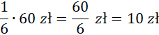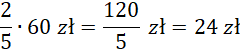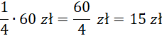 Pomnóż kolejne ułamki przez ilość pieniędzy, które miał Janek, aby otrzymać ceny poszczególnych przedmiotów.