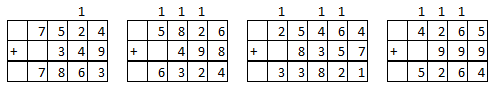 Dodawaj liczby kolumnami. Jeśli liczba jest większa niż 10, wpisz w wyniku liczbę jedności, a liczbę dziesiątek przenieś do kolejnej kolumny.