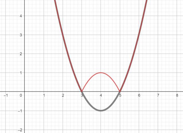 By narysować wykres funkcji g, wykonaj przekształcenie g(x) = |f(x)| (f(x) = (x - 4)2 - 1). W celu wykonania tego przekształcenia, punkty znajdujące się nad osią OX pozostaw bez zmian, a te znajdujące się pod osią OX odbij symetrycznie względem niej – kolor czerwony.