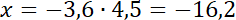 Skorzystaj ze wskazówki. Liczba 4,5 razy mniejsza od x daje –3,6, więc liczba 3,6 razy większa od liczby (–3,6) jest równa szukanej wartości x. Pamiętaj, iloczyn lub iloraz liczby dodatniej i ujemnej jest liczbą ujemną.