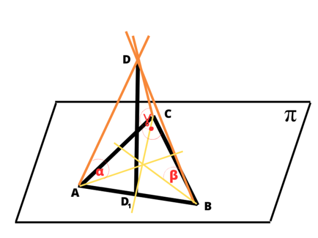 ACB| = 90°, punkt D nie należy do płaszczyzny π i jeśli rzut prostokątny punktu D na płaszczyznę π leży między punktami A i B.