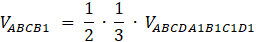 W tym zadaniu musisz obliczyć, jaką część objętości sześcianu ABCDA1B1C1D1 stanowi objętość ostrosłupa ABCB1, jeśli w sześcianie poprowadzono płaszczyznę (ACB1), która odcięła ostrosłup ABCB1 (rysunek obok).
