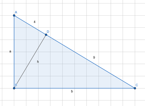 Wylicz przyprostokątne trójkąta prostokątnego, jeśli wysokość poprowadzona z wierzchołka kąta prostego dzieli przeciwprostokątną na odcinki o długości: 4 cm; 9 cm.