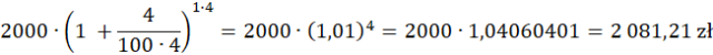 2000 zł wpłacono na lokatę oprocentowaną 4%. Jeśli kapitalizacja odsetek jest kwartalna, jaka kwota będzie na lokacie po roku?