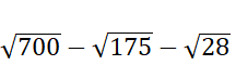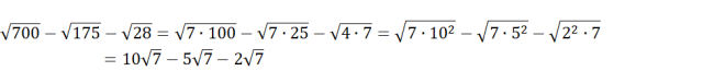 Rozłóż liczby pod pierwiastkami na iloczyn 7 i odpowiednich liczb, a następnie oblicz pierwiastki korzystając z własności: .