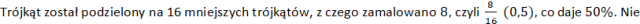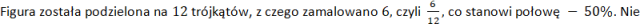 Trójkąt został podzielony na 2 mniejsze, z czego zamalowany jest jeden, czyli połowa, co daje 50%. Nie zamalowano więc 50%.