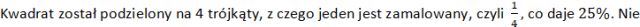 Figura została podzielona na 4 trójkąty i każdy z nich zamalowano, czyli 100%. Nie zamalowano więc 0%.