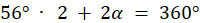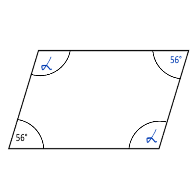 Ponieważ naprzeciwległe kąty w równoległoboku są sobie równe, to jeden z nieznanych kątów to 56°. Suma kąta kątów w czworokącie to 360°, więc oznaczając nieznany kąt przez α: