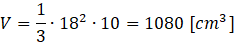 Wyznacz objętość ostrosłupa prawidłowego czworokątnego, którego krawędź podstawy ma długość 18 cm, a wysokość wynosi 10 cm.