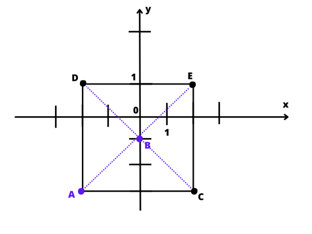 Nanieś punkty A = (-2, -3) i B = (0, -1) w układzie współrzędnych, a następnie narysuj taki kwadrat, że punkt A jest jego wierzchołkiem, a punkt B punktem przecięcia przekątnych tego kwadratu.