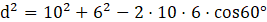 Wyznacz długość przekątnej trapezu równoramiennego, gdzie dłuższa podstawa ma długość 10 cm, ramię ma długość 6 cm, a kąt między ramieniem i dłuższą podstawą ma miarę
