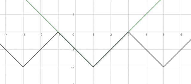 Aby naszkicować wykres funkcji zacznij od naszkicowania wykresu funkcji g – kolor zielony. Następnie zaznacz fragment wykresy funkcji f, który pokrywa się z wykresem funkcji g. Ponieważ fragment ten ma długość okresu T, aby naszkicować wykres funkcji f powtarzaj ten wykres uzupełniając go dla całej dziedziny funkcji.