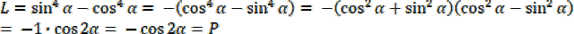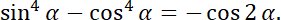 Aby udowodnić, że zależność jest tożsamością przekształć najpierw jej lewą stronę wyłączając – przed nawias. Następnie zastosuj wzór skróconego mnożenia na różnicę kwadratów. Kolejno wykorzystaj jedynkę trygonometryczną i wzór na cosinus podwojonego kąta.