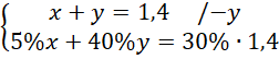Oblicz, ile gramów każdego z tych roztworów użyto, jeśli otrzymano 1,4 kg roztworu soli o stężeniu 30%, jeśli roztwór soli o stężeniu 5% zmniejszono z roztworem soli o stężeniu 40%.