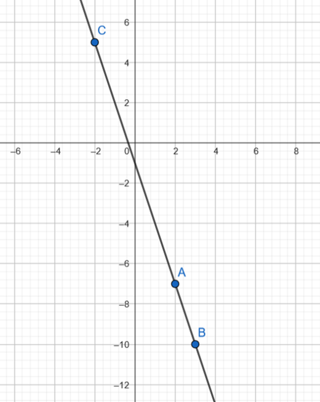 Ustal, czy punkty A(2,-7), B(3,-10), C(-2,5) należą do wykresu tej samej funkcji liniowej.