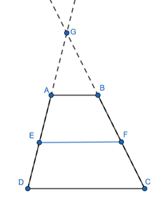 Udowodnij, że w trapezie niebędącym równoległobokiem odcinek łączący środki ramion trapezu jest równoległy do jego podstaw (rozpatrz kąt otrzymany przez przedłużenie ramion trapezu).