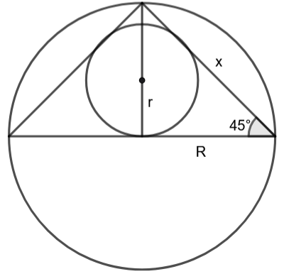 Skorzystaj ze wzoru na cosinus w trójkącie prostokątnym i wyznacz długość ramienia trójkąta. Następnie skorzystaj ze wzoru na promień okręgu wpisanego w trójkąt prostokątny i wyznacz jego długość. Na koniec oblicz stosunek objętości kuli wpisanej i opisanej na tym trójkącie.