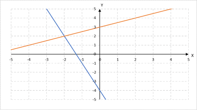 Układy te są układami oznaczonymi, co świadczy o tym, że proste przecinają się w jednym punkcie i mają jedno rozwiązanie. Aby przedstawić interpretację geometryczną, należy równania doprowadzić do postaci kierunkowej tzn. y = ax + b, następnie narysować w jednym układzie współrzędnych i odczytaj punkt przecięcia prostych, będący rozwiązaniem tego układu.