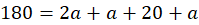 Najmniejszy kąt w trójkącie jest o połowę mniejszy od największego i o 20° mniej niż średni. Zapisz równanie, które pozwala obliczyć: