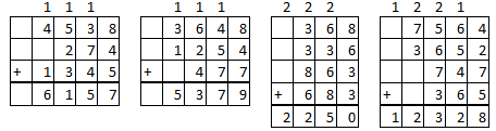 Dodawaj liczby kolumnami. Jeśli liczba jest większa niż 10, wpisz w wyniku liczbę jedności, a liczbę dziesiątek przenieś do kolejnej kolumny.