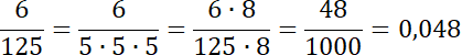 Zwróć uwagę, w mianowniku po rozłożeniu go na czynniki pierwsze, występują tylko liczby 5, więc ułamek jest skończony. Rozszerz go do mianownika równego 1000, a następnie zamień na ułamek dziesiętny.
