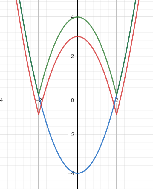 Następnie wykonaj przekształcenie g(x) = |f(x)| (f(x) = x2 - 4). W celu wykonania tego przekształcenia, punkty znajdujące się nad osią OX pozostaw bez zmian, a te znajdujące się pod osią OX odbij symetrycznie względem niej – kolor zielony.